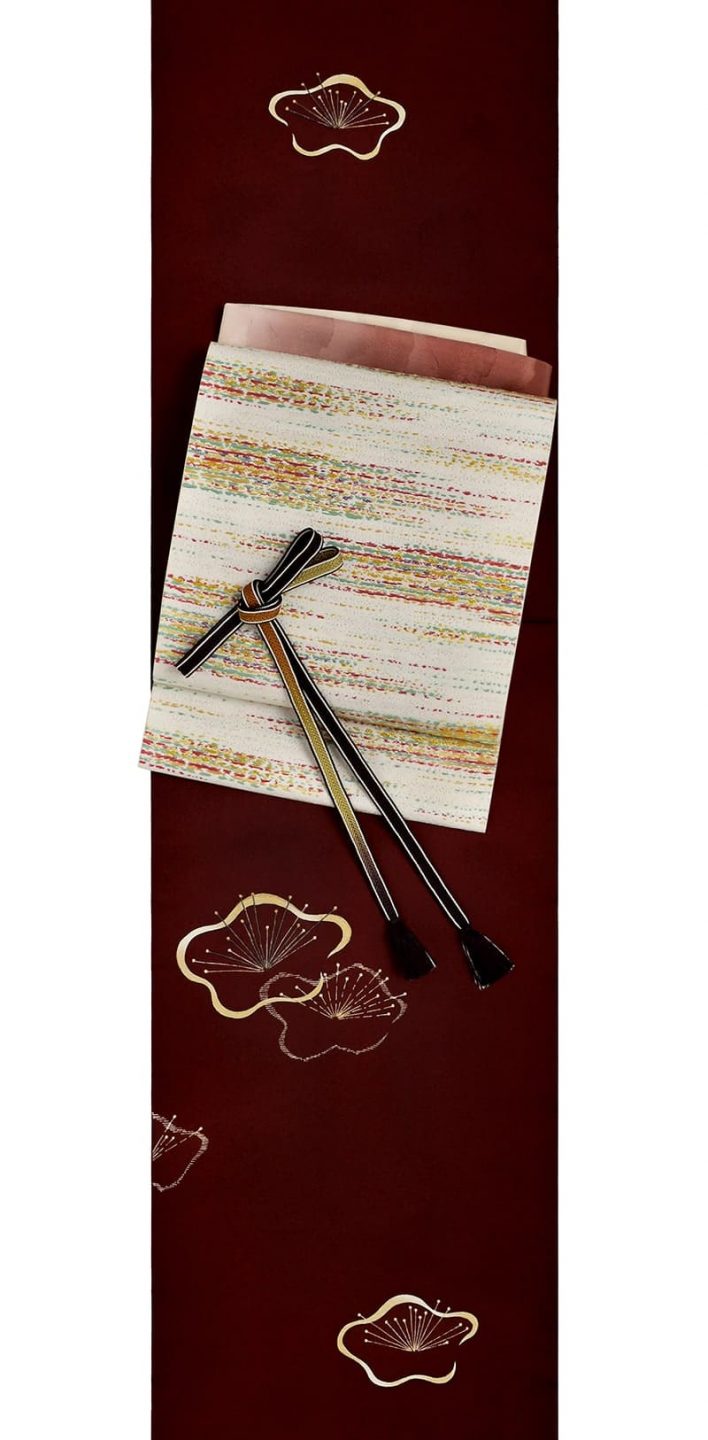 温かみのある葡萄色(えびいろ)の地色の上に、琳派の画風で描かれた梅の柄が楽しい付下に、明るいコントラストを作ってくれる白地の袋帯を合わせました。
