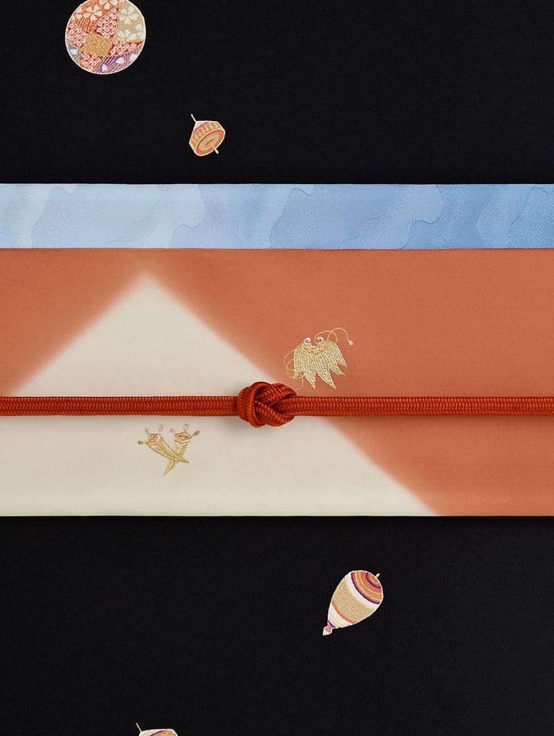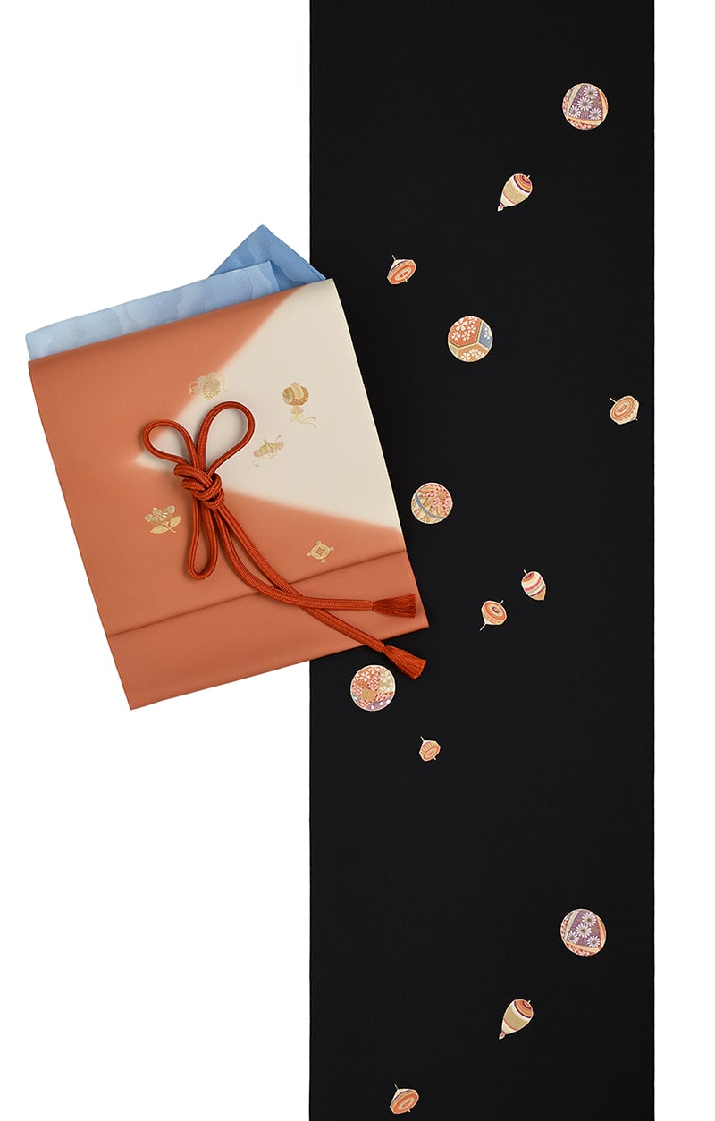 手まりと独楽が弾むような流れが美しい小紋に、宝尽くしの染め帯を合わせたおめでたいコーディネート。
