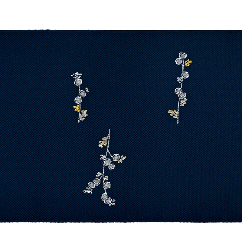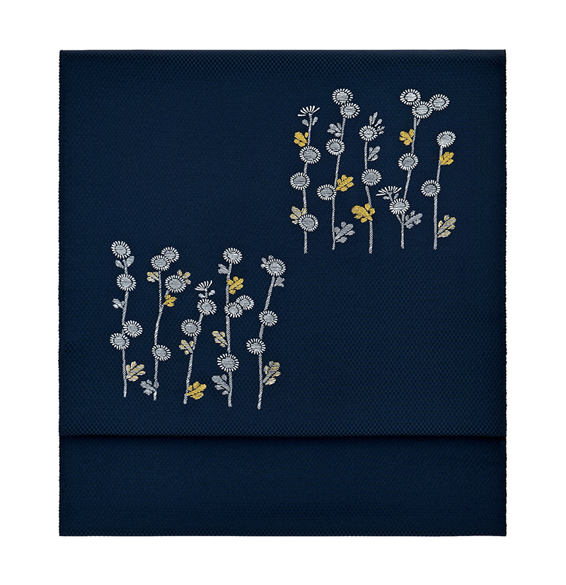 長寿の象徴であり、古くから好まれてきた菊の花を、縦に伸びる愛らしい姿で描いた秋らしい染め帯です。小菊が秋の風に揺れる可憐な様を、手描きの糊の繊細な線描写と刺繍で表現しています。