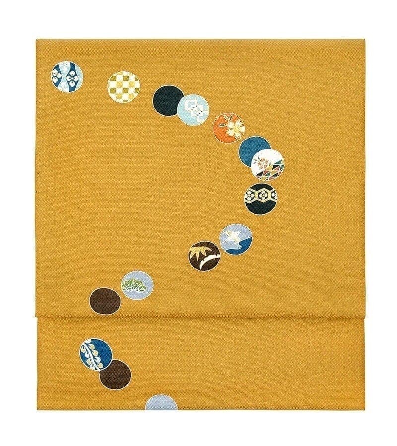 明るい黄土色の地色の上を踊る、色取り取りの小さな丸が可愛らしい染め帯です。