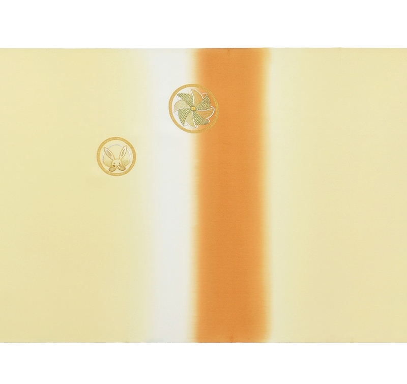 狂言で使われる衣裳に見られる、円の中に器物や草花などを入れ込んだ文様を、千總らしい橘や、おめでたいふくら雀などでアレンジしました。温かなクリームやオレンジの地色と丸い優しい文様が愛くるしい印象を生み出しています。