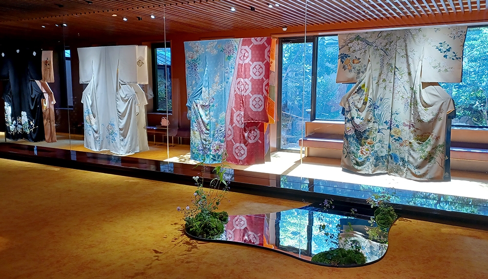 千總本店では、季節の草花と小鳥の囀りがお出迎えしてくれる特別な空間の中で、まるで森の小径を散策するように新作のコレクションをお楽しみいただけます。