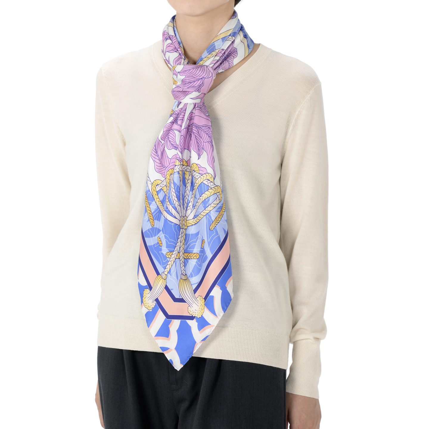 軽くなめらかなシルク100%の生地はジャケットやコートの下に合わせてもすっきりと巻けるボリュームで、顔周りを明るく演出してくれます。