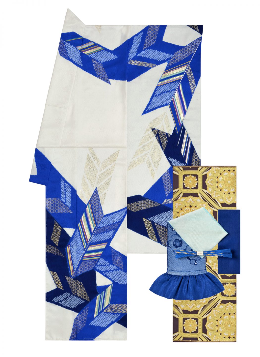 藍色と白地のコントラストが大胆な振袖に、ゴールドが映える袋帯と、ブルー系の小物でまとめることでゴージャスかつクールな印象を与えます。