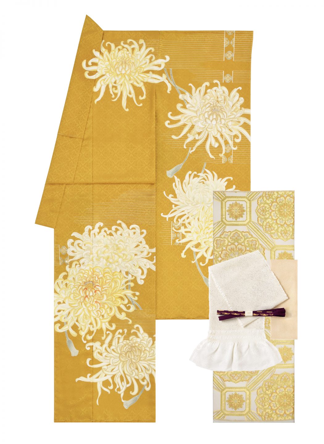 マスタード色と白のコントラストが華やかな振袖に、同色系統の袋帯と小物で合わせ、濃い色の帯締めをアクセントにしたワントーンコーディネートです。