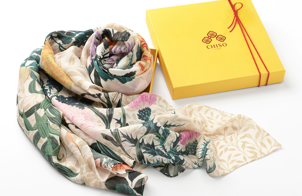 きものなどの一部の商品を除き、ご注文いただいた商品は、千總のオリジナルボックスに入れ、朱色の組紐でラッピングをしてお届けいたします。