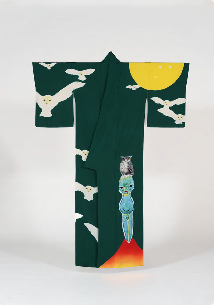 加藤 たぶんどの業界も似ているんじゃないかと思うんですけど、絵描きたちは、ほかの表現もあるなかでなぜ絵を描くか? ということについて考え続けて、結局は今も、(自然界においては)四角い不自然なものに描いている。着物の場合も、現代には洋服とかもありながら、いまだに誰かが発明した折り紙みたいなものが存在しているわけです。そんななか、千總さんに自由に着物を作ってくれ、と言われたときに、着物自体を破って切り刻んだりするのは違うと思った。それは僕がすごく変な形のキャンバスに奇を衒って描くみたいなことと同じだから、着物の形自体は絶対崩さないという考えは最初からありました。